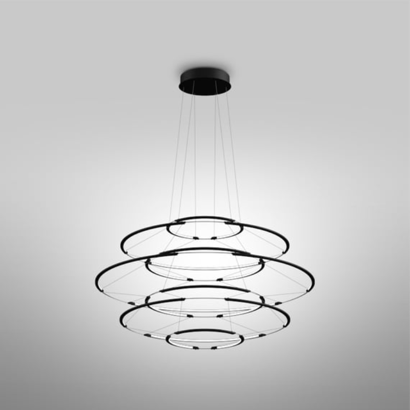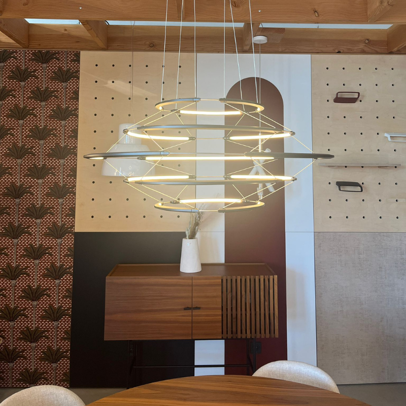 La Drop 5 de Nemo Lighting est une suspension emblématique qui marie innovation technologique et esthétique minimaliste. Conçue par le designer japonais Arihiro Miyake, elle se compose de cinq anneaux en aluminium ultra-fin, reliés par des connexions miniaturisées, créant une structure légère et flottante.